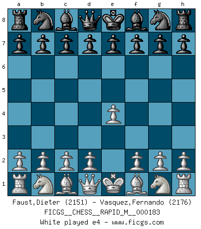 First move 2026 April 4 19:48:32 White clock - 29 days 11:54:22 Black clock - 30 days 00:00:00 [Event "FICGS__CHESS__RAPID_M__000183"] [Site "FICGS"] [Date "2026.04.04"] [Round "1"] [White "Faust,Dieter"] [Black "Vasquez,Fernando"] [Result "*"] [WhiteElo "2151"] [BlackElo "2176"] 1.* Follow this game move after move (download)Nonsense was the last thing Fischer was interested in, as far as Chess was concerned. (Elie Agur) Sie führen leise Selbstgespräche, schlürfen lautstark ihre Getränke, schmatzen hörbar beim Essen, blasen ihrem Gegenüber Rauch in die Augen, niesen ihm ins Gesicht, starren ihn unverwandt an, bis er sich unter ihren Blicken windet, rutschen ständig auf ihrem Stuhl hin und her, rülpsen und bohren in der Nase. (Anonymous) Un juego de Ajedrez es un dialogo, una conversación entre un jugador y su oponente. Cada movimiento del oponente puede contener amenazas o tropiezos, pero un jugador no se puede defender de las amenazas o tomar ventaja de los tropiezos si es que no se pregunta a sí mismo: ¿Que es lo que mi oponente va a hacer después de cada movida?. (Bruce A. Moon) C'est la seule position que je connaisse où les deux camps sont mals. Propos prêtés à V. Anand. Statistics can be made to prove anything - even the truth. (Author unknown)