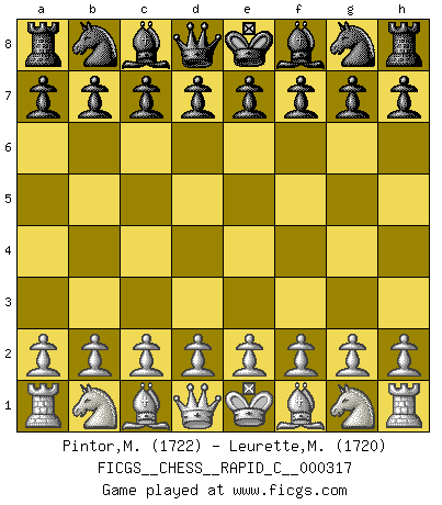 First move 2026 April 6 4:42:15 White clock - 29 days 21:40:18 Black clock - 30 days 00:00:00 [Event "FICGS__CHESS__RAPID_C__000317"] [Site "FICGS"] [Date "2026.04.06"] [Round "1"] [White "Pintor,Manuel"] [Black "Leurette,Marc-Antoine"] [Result "*"] [WhiteElo "1722"] [BlackElo "1720"] 1.* Follow this game move after move (download)I guess a certain amount of temperament is expected of Chess geniuses. (Ron Gross) Wie gewinnt Tal? Er entwickelt alle seine Figuren in die Brettmitte und opfert sie dann irgendwo. (Robert James Fischer) En el Ajedrez, tal como es jugado por los Maestros, practicamente la suerte es eliminada. (Emanuel Lasker) Je menace de comprendre la position. (Anonyme) The good fighters of old first put themselves beyond the possibility of defeat, and then waited for an opportunity of defeating the enemy. (Sun Tzu)
