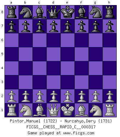 First move 2026 April 6 4:42:15 White clock - 29 days 18:42:38 Black clock - 30 days 00:00:00 [Event "FICGS__CHESS__RAPID_C__000317"] [Site "FICGS"] [Date "2026.04.06"] [Round "1"] [White "Pintor,Manuel"] [Black "Nurcahyo,Dery"] [Result "*"] [WhiteElo "1722"] [BlackElo "1731"] 1.* Follow this game move after move (download)Adequate compensation for a sacrifice is having a sound combination leading to a winning position; adequate compensation for a blunder is having your opponent snatch defeat from the jaws of victory. (Bruce A. Moon) Wenn Dein Gegner dir ein Remis anbietet, versuch herauszufinden, weshalb er glaubt schlechter zu stehen. (Nigel Short) El sobresalir en el Ajedrez es un signo de una mente intrigante. (Sir Arthur Conan Doyle) Il vaut mieux sacrifier les pièces de l'adversaire. (Xavier Tartacover) Who needs drugs and alcohol if he can play Big Chess at FICGS ? (Heinz-Georg Lehnhoff)