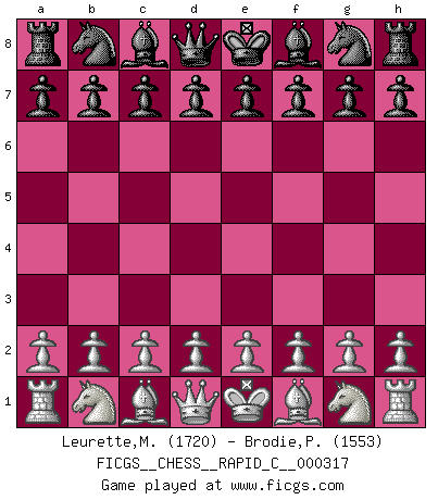 First move 2026 April 6 4:42:15 White clock - 29 days 21:40:19 Black clock - 30 days 00:00:00 [Event "FICGS__CHESS__RAPID_C__000317"] [Site "FICGS"] [Date "2026.04.06"] [Round "1"] [White "Leurette,Marc-Antoine"] [Black "Brodie,Peter"] [Result "*"] [WhiteElo "1720"] [BlackElo "1553"] 1.* Follow this game move after move (download)Chess is played with the mind and not with the hands ! (Renaud and Kahn) Spielt Blackmar-Diemer-Gambit, und das Matt kommt von selbst! (Emil Joseph Diemer) Yo considero que Fischer es uno de los expertos mas grandes de aperturas de siempre. (Keith Hayward) Le plus grand jeu de l'esprit jamais inventé, plus vous l'apprenez, plus vous y prenez du plaisir. (Garry Kasparov) If you ain't just a little scared when you enter a casino, you are either very rich or you haven't studied the games enough. (Pappy)