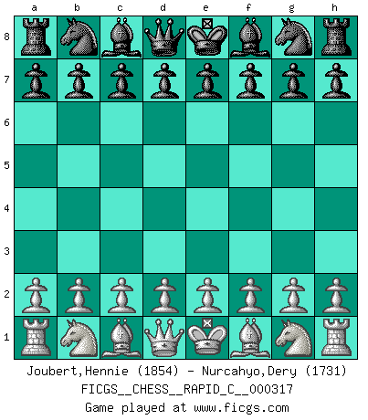 First move 2026 April 6 4:42:15 White clock - 29 days 18:42:37 Black clock - 30 days 00:00:00 [Event "FICGS__CHESS__RAPID_C__000317"] [Site "FICGS"] [Date "2026.04.06"] [Round "1"] [White "Joubert,Hennie"] [Black "Nurcahyo,Dery"] [Result "*"] [WhiteElo "1854"] [BlackElo "1731"] 1.* Follow this game move after move (download)Chess is not like life... it has rules ! (Mark Pasternak) Ohne ihre Erfolge schmälern zu wollen würde ich sagen Petrosian, Spassky und Karpov verdanken ihre Siege ihren Trainern - Boleslavsky, Bondarevsky und Furman. (Mikhail Moiseyevich Botvinik) Cuando me preguntan: -¿Cual es el secreto que te hace hacer mejores movidas que tus oponentes?, Yo respondo: Me da gusto que me pregunten eso, porque, como veran, hay una simple razón. Yo pienso mis propias movidas y dejo a mi oponente que el piense las suyas. (Alexander Alekhine) Des idées, des idées, j'en ai cent, j'en ai mille. Des bonnes, des mauvaises, applicables, irréalisables... Il suffit de faire le tri ! (Roos) O divine art of subtlety and secrecy! Through you we learn to be invisible, through you inaudible and hence we can hold the enemy's fate in our hands. (Sun Tzu)
