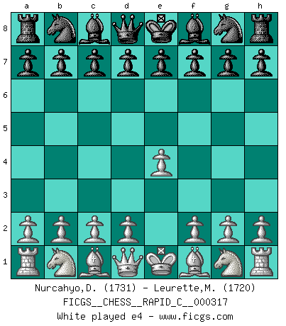 First move 2026 April 6 4:42:15 White clock - 29 days 21:40:19 Black clock - 30 days 00:00:00 [Event "FICGS__CHESS__RAPID_C__000317"] [Site "FICGS"] [Date "2026.04.06"] [Round "1"] [White "Nurcahyo,Dery"] [Black "Leurette,Marc-Antoine"] [Result "*"] [WhiteElo "1731"] [BlackElo "1720"] 1.* Follow this game move after move (download)Fischer is completely natural. He plays no roles. He's like a child. Very, very simple. (Zita Rajcsanyi) Heutzutage gewinnt im Turnier nicht derjenige Spieler, der weitreichende Pläne entwirft, sondern einfach jener, der Zug um Zug kämpft. (David Bronstein) El Ajedrez es imaginación. (David Bronstein) J'ai toujours senti une vague pitié pour l'homme qui ne connaît rien aux échecs, tout comme j'en aurais pour un homme ignorant de l'amour. Les Echecs, comme la musique ou comme l'amour, ont le pouvoir de rendre heureux. (Siegbert Tarrasch) Every man's memory is his private literature. (Aldous Huxley)