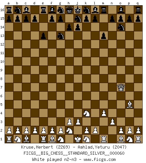 Last move : n2-n3 2026 April 8 20:57:22 White clock - 34 days 20:17:32 Black clock - 33 days 13:21:00 [Event "FICGS__BIG_CHESS__STANDARD_SILVER__000060"] [Site "FICGS"] [Date "2026.04.08"] [Round "1"] [White "Kruse,Herbert"] [Black "Aahlad,Yeturu"] [Result "*"] [WhiteElo "2269"] [BlackElo "2047"] 1.j2-k4 h15-g13 2.h1-o7 m15-m13 3.m2-m4 e15-e13 4.l1-p5 p16-o14 5.n2-n3 * Follow this game move after move (download)Chess is 99 percent tactics. (Teichmann) Ein Gewinn durch eine ungenaue Kombination, sei sie auch noch so vorzeigbar, erfüllt mich mit Schaudern. (Wilhelm Steinitz) Evita las multitudes. Haz independientemente tu propio razonamiento. Trata de ser el jugador de Ajedrez, no la pieza de Ajedrez. (Ralph Charell) Le jeu d'échecs fait naître et fortifie en nous plusieurs qualités précieuses dans le cours de l'existence, telles que la prévoyance, la circonspection, la prudence, et la persévérance. (Benjamin Franklin - 1783, la morale des échecs) Perhaps chess is the wrong game for the times (The Chess Master and the Computer, by Garry Kasparov - 2010)