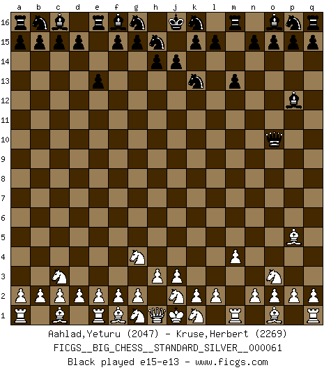 Last move : e15-e13 2026 April 8 20:58:3 White clock - 34 days 13:22:00 Black clock - 34 days 21:20:45 [Event "FICGS__BIG_CHESS__STANDARD_SILVER__000061"] [Site "FICGS"] [Date "2026.04.08"] [Round "1"] [White "Aahlad,Yeturu"] [Black "Kruse,Herbert"] [Result "*"] [WhiteElo "2047"] [BlackElo "2269"] 1.m2-m4 j15-k13 2.b1-c3 h16-o10 3.h2-g4 m15-m13 4.p1-o3 l16-p12 5.l1-p5 e15-e13 6.* Follow this game move after move (download)If I win a tournament, I win it by myself. I do the playing. Nobody helps me. (Bobby Fischer) Es hat in meinem Leben Zeiten gegeben, da ich sehr nahe daran war zu glauben, daß ich auch nicht eine einzige Schachpartie verlieren könnte. (José Raúl Capablanca) Existen dos clases de sacrificios: los correctos y los míos. (Mikhail Tal) Le joueur d'Echecs qui veut atteindre le top est obligé de développer son propre credo créatif. Alexeï Stepanovicth Souétine. Il est facile d'écrire des livres ! Ce qui est difficile, c'est de jouer ! (Alexeï Stepanovicth Souétine) The meaning of life is that it is to be lived, and it is not to be traded and conceptualized and squeezed into a pattern of systems. (Bruce Lee)