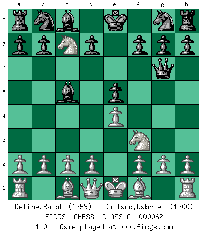 Last move : 1-0 2007 November 29 19:56:39 [Event "FICGS__CHESS__CLASS_C__000062"] [Site "FICGS"] [Date "2007.10.16"] [Round "1"] [White "Deline,Ralph"] [Black "Collard,Gabriel"] [Result "1-0"] [WhiteElo "1759"] [BlackElo "1700"] 1.e4 e5 2.Nf3 Qf6 3.Nc3 Bc5 4.Nd5 Qg6 5.Nxc7+ 1-0 This chess game has been lost on time (started : 2007.10.16 0:16:13) Greco defense Player White won this chess game. Follow this game move after move (download)You must take your opponent into a deep dark forest where 2+2=5, and the path leading out is only wide enough for one. (Mikhail Tal) Später, ... hatte ich zunehmend Erfolg in entscheidenden Partien. Vielleicht weil ich eine einfache Wahrheit erkannte: nicht nur ich hatte Angst, auch mein Gegner. (Mikhail Nekhemyevich Tal) Sin errores no puede haber brillantez. (Emanuel Lasker) Assurément je connaissais par expérience le mystérieux attrait de ce jeu royal, le seul entre tous les jeux inventés par les hommes qui échappe souverainement à la tyrannie du hasard, le seul où l'on ne doive sa victoire qu'à son intelligence ou plutôt à une certaine forme d'intelligence. Mais n'est-ce pas déjà le limiter injurieusement que d'appeler les échecs un jeu ? N'est-ce pas une science, un art ou quelque chose qui, comme le cercueil de Mahomet entre ciel et terre, est suspendu entre l'un et l'autre, et qui réunit un nombre incroyable de contraires ? [...] C'est une pensée qui ne mène à rien, une mathématique qui n'établit rien, un art qui ne laisse pas d'uvre, une architecture sans matière; et il l'a prouvé néanmoins qu'il était plus durable, à sa manière, que les livres ou que tout autre monument, ce jeu unique qui appartient à tous les peuples et à tous les temps, et dont personne ne sait quel dieu en fit don à la terre pour tuer l'ennui, pour aiguiser l'esprit et stimuler l'âme. Où commence-t-il, où finit-il ? (Stefan Zweig) In my experience, there's no such thing as luck. (Obi-Wan Kenobi in Star Wars ep.4)