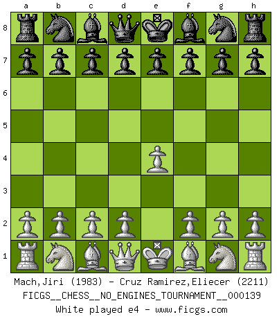 First move 2026 April 14 13:8:59 White clock - 39 days 15:27:43 Black clock - 40 days 00:00:00 [Event "FICGS__CHESS__NO_ENGINES_TOURNAMENT__000139"] [Site "FICGS"] [Date "2026.04.14"] [Round "1"] [White "Mach,Jiri"] [Black "Cruz Ramirez,Eliecer"] [Result "*"] [WhiteElo "1983"] [BlackElo "2211"] 1.* Follow this game move after move (download)The Pin is mightier than the sword. (Fred Reinfeld) Später, ... hatte ich zunehmend Erfolg in entscheidenden Partien. Vielleicht weil ich eine einfache Wahrheit erkannte: nicht nur ich hatte Angst, auch mein Gegner. (Mikhail Nekhemyevich Tal) Sin errores no puede haber brillantez. (Emanuel Lasker) Avant la finale, les dieux ont créé le milieu de partie. (Tarrasch) May the force be with you. (Han Solo in Star Wars ep.4)