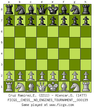 First move 2026 April 14 13:8:59 White clock - 39 days 15:27:43 Black clock - 40 days 00:00:00 [Event "FICGS__CHESS__NO_ENGINES_TOURNAMENT__000139"] [Site "FICGS"] [Date "2026.04.14"] [Round "1"] [White "Cruz Ramirez,Eliecer"] [Black "Alencar,Ofir"] [Result "*"] [WhiteElo "2211"] [BlackElo "1477"] 1.* Follow this game move after move (download)It is no time to be playing Chess when the house is on fire. (Italian Proverb) Ein Großmeister muß tausende Partien in seinem Kopf speichern, denn diese sind für Ihn, was die Worte der Muttersprache für gewöhnliche Leute sind, oder Noten für Musiker... (Garry Kasparov) El Ajedrez te enseña a controlarl la excitación inicial que sientes cuando vez algo que parece bueno y te enseña a pensar objetivamente cuando te encuentras en problemas. (Stanley Kubrick) Le profane ne songe pas à la somme de jouissance dont il se prive, qui méconnaît ce jeu aux ressources aussi variées que passionnantes. (Jean-Marie Jeanton-Lamarche) No enterprise is more likely to succeed than one concealed from the enemy until it is ripe for execution. (Niccolo Machiavelli)