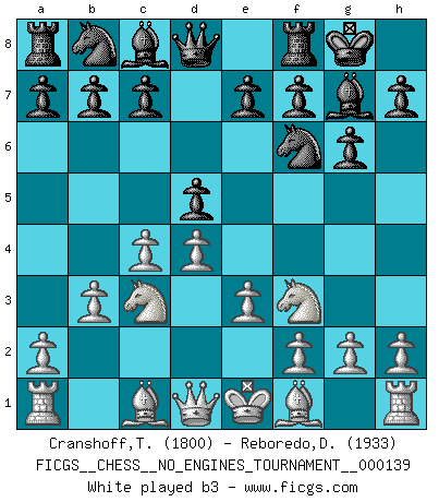 Last move : b3 2026 April 14 18:27:21 White clock - 39 days 20:18:13 Black clock - 39 days 15:49:38 [Event "FICGS__CHESS__NO_ENGINES_TOURNAMENT__000139"] [Site "FICGS"] [Date "2026.04.14"] [Round "1"] [White "Cranshoff,Thomas"] [Black "Reboredo,Daniel"] [Result "*"] [WhiteElo "1800"] [BlackElo "1933"] 1.Nf3 Nf6 2.c4 g6 3.d4 d5 4.e3 Bg7 5.Nc3 O-O 6.b3 * Follow this game move after move (download)Daring ideas are like Chess men moved forward. They may be beaten, but they may start a winning game. (Johann Wolfgang von Goethe) Schach ist Krieg, im Schach geht es um testosterongesteuerte Urschreie. (Garry Kasparov) Tu cuerpo tiene que estar en óptima condición. Tu Ajedrez se deteriora como lo hace tu cuerpo. No puedes separar la mente y el cuerpo. (Bobby Fischer) Ce n'est pas pour s'amuser qu'il joue aux échecs : il célèbre un culte. (Vladimir Nabokov) At work, the authority of a person is inversely proportional to the number of pens that person is carrying. (Dan Rotaru)