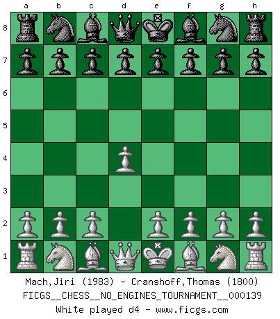 Last move : d4 2026 April 14 23:17:24 White clock - 39 days 13:51:35 Black clock - 39 days 22:24:26 [Event "FICGS__CHESS__NO_ENGINES_TOURNAMENT__000139"] [Site "FICGS"] [Date "2026.04.14"] [Round "1"] [White "Mach,Jiri"] [Black "Cranshoff,Thomas"] [Result "*"] [WhiteElo "1983"] [BlackElo "1800"] 1.d4 * Follow this game move after move (download)A Chess game is a dialogue, a conversation between a player and his opponent. Each move by the opponent may contain threats or be a blunder, but a player cannot defend against threats or take advantage of blunders if he does not first ask himself: What is my opponent planning after each move ? (Bruce A. Moon) Aljechin war kein Nazi. Er war ein Opportunist. Ein schrecklicher Mann. Er liebte Geld über alles und würde für Geld ein Jude, ein Katolik oder ein Protestant werden. (Miguel Najdorf) Sin errores no puede haber brillantez. (Emanuel Lasker) Votre prénom est 'Tactique', votre deuxième prénom est 'Tactique' et votre nom est 'Tactique'. (Ken Smith) I'm extremely disappointed. I send you out for exciting, new designer drugs, you come back with tomato sauce. (Gregory House, House M.D.)