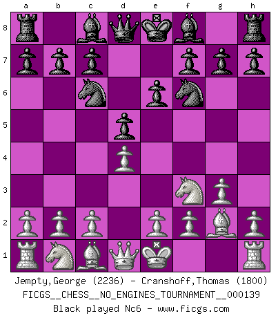 Last move : Nc6 2026 April 14 22:6:59 White clock - 39 days 18:11:55 Black clock - 39 days 18:03:07 [Event "FICGS__CHESS__NO_ENGINES_TOURNAMENT__000139"] [Site "FICGS"] [Date "2026.04.14"] [Round "1"] [White "Jempty,George"] [Black "Cranshoff,Thomas"] [Result "*"] [WhiteElo "2236"] [BlackElo "1800"] 1.d4 d5 2.g3 e6 3.Bg2 Nf6 4.Nf3 Nc6 5.* Follow this game move after move (download)When you don't know what to do, wait for your opponent to get an idea - it's sure to be wrong. (Tarrasch) Auf jeden Fall musst du zuerst Rechtsanwalt werden, damit du deine eigenen Interessen und die deiner Familie vertreten kannst. [Brief an seinen Sohn] (José Raúl Capablanca) Si el ingenio solamente fuese necesario para lucirse, las mujeres serían las mejores jugadoras de Ajedrez del mundo. (Albin) La victoire dans une partie d'Echecs appartient la plupart du temps à celui qui voit un peu plus loin que l'adversaire. (Lasker) I feel so... helpless. (C-3PO in Star Wars ep.3)