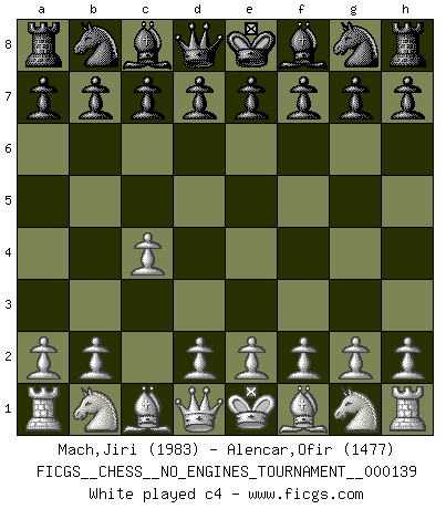 Last move : c4 2026 April 14 23:17:31 White clock - 39 days 13:51:28 Black clock - 39 days 22:24:32 [Event "FICGS__CHESS__NO_ENGINES_TOURNAMENT__000139"] [Site "FICGS"] [Date "2026.04.14"] [Round "1"] [White "Mach,Jiri"] [Black "Alencar,Ofir"] [Result "*"] [WhiteElo "1983"] [BlackElo "1477"] 1.c4 * Follow this game move after move (download)A thorough understanding of the typical mating continuations makes the most complicated sacrificial combinations leading up to them not only not difficult, but almost a matter of course. (Siegbert Tarrasch) Ein Schachspiel besteht aus drei Phasen: Die erste, wenn du hofftst den Vorteil zu haben, die zweite, wenn du glaubst einen Vorteil zu haben, und die dritte.... wenn du weißt Du wirst verlieren. (Savielly Grigorievitsch Tartakower) El Ajedrez se juega con la mente... ¡no con las manos!. (Renaud y Kahn) Mais n'est-ce pas déjà le limiter injurieusement que d'appeler les échecs un jeu? N'est-ce pas aussi une science, un art, ou quelque chose qui, comme le cercueil de Mahomet entre ciel et terre, est suspendu entre l'un et l'autre, et qui réunit un nombre incroyable de contraires ? (Stefan Zweig) They misunderestimated me. (George W. Bush, Bentonville nov. 6, 2000)
