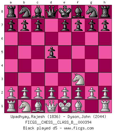 Last move : d5 2026 April 14 21:6:16 White clock - 39 days 16:57:07 Black clock - 39 days 22:37:04 [Event "FICGS__CHESS__CLASS_B__000394"] [Site "FICGS"] [Date "2026.04.14"] [Round "1"] [White "Upadhyay,Rajesh"] [Black "Dyson,John"] [Result "*"] [WhiteElo "1836"] [BlackElo "2044"] 1.Nf3 d5 2.* Follow this game move after move (download)Castle early and often. (Rob Sillars) Garry Kasparov war erst in der Großmeister-Organisation GMA, dann in der Profischach-Vereinigung PCA, zum Schluss kehrte er wieder in den Schoß der FIDE zurück. Aber gut, manche Leute sind flexibel (Viswanathan Anand) El Ajedrez es un terrible juego. Si no controlas el centro, tu oponente tiene una posición mas holgada. Si tienes control del centro, ¡entonces realmente tu tienes algo de que preocuparte!. (Siegbert Tarrasch) RxDa4 pat (...) A married woman is like a fish riding a bicycle. (Rodolfo d'Ettorre)