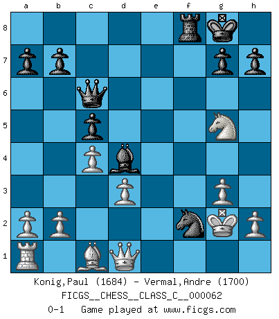 Last move : 0-1 2007 December 23 16:56:42 [Event "FICGS__CHESS__CLASS_C__000062"] [Site "FICGS"] [Date "2007.10.16"] [Round "1"] [White "Konig,Paul"] [Black "Vermal,Andre"] [Result "0-1"] [WhiteElo "1684"] [BlackElo "1700"] 1.e4 c5 2.f4 d5 3.exd5 Nf6 4.Bb5+ Bd7 5.Bxd7+ Qxd7 6.c4 e6 7.Qe2 Bd6 8.dxe6 fxe6 9.d3 O-O 10.Nf3 Nc6 11.O-O Rae8 12.Nc3 e5 13.fxe5 Nxe5 14.Nxe5 Bxe5 15.Ne4 Ng4 16.Rxf8+ Rxf8 17.g3 Bd4+ 18.Kg2 Qe6 19.Qd1 Nf2 20.Ng5 Qc6+ 0-1 Sicilian : Grand Prix attack Kingside Castling by player Black (move 9) Kingside Castling by player White (move 11) Player Black won this chess game. Follow this game move after move (download)Chess is a fighting game which is purely intellectual and includes chance. (Richard Reti) Alles was ich jemals tun will ist Schach spielen. (Robert James Fischer) Por la belleza de sus partidas, la claridad de su juego y lo brillante de sus ideas, Fischer se creó el mismo como un artista de la misma estatura como Brahms, Rembrandt y Shakespeare. (David Levy) Le système Elo représente seulement une moyenne. Il est simplement un indicateur de votre stabilité. (Anatoli Karpov) The good fighters of old first put themselves beyond the possibility of defeat, and then waited for an opportunity of defeating the enemy. (Sun Tzu)
