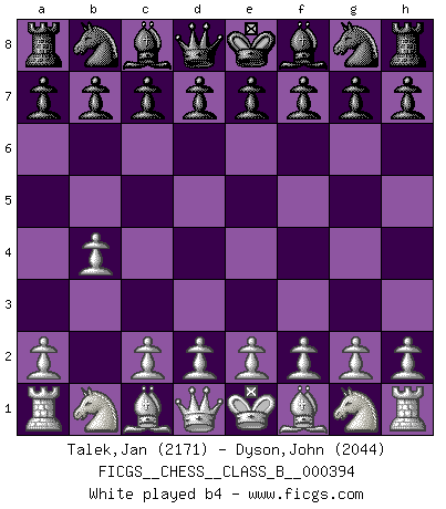 Last move : b4 2026 April 14 23:53:29 White clock - 39 days 14:54:27 Black clock - 39 days 22:04:35 [Event "FICGS__CHESS__CLASS_B__000394"] [Site "FICGS"] [Date "2026.04.14"] [Round "1"] [White "Talek,Jan"] [Black "Dyson,John"] [Result "*"] [WhiteElo "2171"] [BlackElo "2044"] 1.b4 * Follow this game move after move (download)One of these modest little moves may be more embarrassing to your opponent than the biggest threat. (Siegbert Tarrasch) Modernes Schach erfordert enorme Anspannung. Es ist für einen normalen Menschen unmöglich das auszuhalten. (Viktor Kortschnoi) La táctica fluye a partir de una posición superior. (Bobby Fischer) Je crois qu'il existe des manières très spécifiques de jouer efficacement contre une machine. Evidemment, nous n'avons aucune chance en technique pure, parce que l'ordinateur calcule de manière parfaite. Mais lorsque nous faisons appel à notre cerveau, en utilisant l'intuition et la compréhension, alors nous restons beaucoup plus forts. (Anatoli Karpov) Question: Is 'This statement is paradoxical' a paradoxical statement ? Or is it a meta-paradox ? (Normajean Yates)
