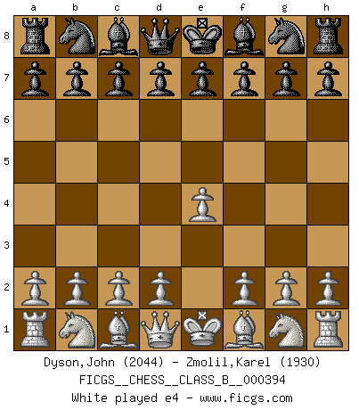 Last move : e4 2026 April 14 21:9:16 White clock - 39 days 22:34:04 Black clock - 39 days 20:08:07 [Event "FICGS__CHESS__CLASS_B__000394"] [Site "FICGS"] [Date "2026.04.14"] [Round "1"] [White "Dyson,John"] [Black "Zmolil,Karel"] [Result "*"] [WhiteElo "2044"] [BlackElo "1930"] 1.e4 * Follow this game move after move (download)Combinations have always been the most intriguing aspect of Chess. The masters look for them, the public applauds them, the critics praise them. It is because combinations are possible that Chess is more than a lifeless mathematical exercise. They are the poetry of the game; they are to Chess what melody is to music. They represent the triumph of mind over matter. (Reuben Fine) Fischer machte Schach einfach zu einer aufregenden Sache, wann immer er sich ans Brett setzte. (Raymond Keene) Una de estas pequeñas movidas modestas pudieran ser mas molestas a tu oponente que la amenaza mas grande. (Siegbert Tarrasch) Soyez une menace à chaque fois que vous vous asseyez pour jouer. (Ken Smith) Thibault, I ask for draw. Game 13876. - Sorry Ilmars, you won. (FICGS chat)