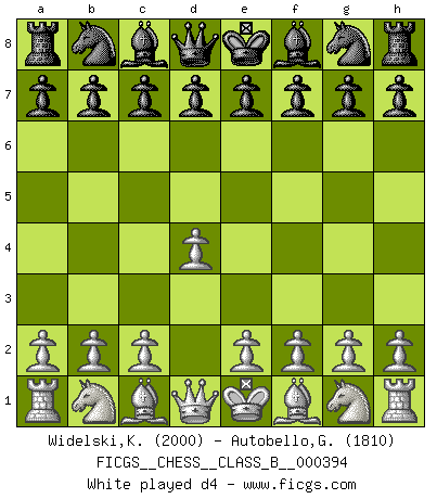 Last move : d4 2026 April 14 17:4:35 White clock - 39 days 21:43:21 Black clock - 39 days 17:21:56 [Event "FICGS__CHESS__CLASS_B__000394"] [Site "FICGS"] [Date "2026.04.14"] [Round "1"] [White "Widelski,Kacper"] [Black "Autobello,Giovanni"] [Result "*"] [WhiteElo "2000"] [BlackElo "1810"] 1.d4 * Follow this game move after move (download)To avoid losing a piece, many a person has lost the game. (Savielly Tartakover) Wer wird heute Abend ihr Gegner sein? -- Heute Abend spiele ich gegen die schwarzen Steine. (Akiba Rubinstein) Tu puedes aprender mucho mas de una partida que pierdas que de una partida ganada. Tendras que perder cientos de partidas antes de llegar a ser un buen jugador. (Jose Raul Capablanca) Si le désir cupide (et stupide) de gagner est une inépuisable source de souffrance, une combinaison brillante sur l'échiquier est une découverte : le coquelicot qui s'épanouit lorsque apparaît la Voie Lactée. (Arrabal) Lottery : A tax on people who are bad at math. (Author unknown)