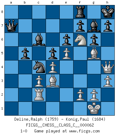 Last move : 1-0 2007 November 10 3:27:54 [Event "FICGS__CHESS__CLASS_C__000062"] [Site "FICGS"] [Date "2007.10.16"] [Round "1"] [White "Deline,Ralph"] [Black "Konig,Paul"] [Result "1-0"] [WhiteElo "1759"] [BlackElo "1684"] 1.e4 c5 2.Nf3 Nc6 3.Bb5 g6 4.O-O Bg7 5.c3 Nf6 6.Re1 O-O 7.d4 cxd4 8.cxd4 d5 9.e5 Ne4 10.Nc3 Nxc3 11.bxc3 Qa5 12.a4 Bg4 13.Re3 Rfc8 14.h3 Bd7 15.Qb3 e6 16.Qb1 a6 17.Bd3 Qd8 18.Re2 Na5 19.Bg5 Qc7 20.Rc2 Nc4 21.Nh2 b5 22.axb5 axb5 23.Rxa8 Rxa8 24.Ng4 Bc6 25.Qc1 Qa7 26.Qf4 Rf8 27.Nf6+ Kh8 28.Qh4 1-0 Sicilian : Nimzovich-Rossolimo attack (with ...g6, without ...d6) Kingside Castling by player White (move 4) Kingside Castling by player Black (move 6) Player White won this chess game. Follow this game move after move (download)We don't really know how the game was invented, though there are suspicions. As soon as we discover the culprits, we'll let you know. (Bruce Pandolfini) Die Jungen erwarten, dass Opa einfach umfällt. Dann aber kann Opa fünf Stunden lang Schach spielen und die jungen Gegner an die Wand drücken. (Viktor Kortschnoi) Morphy probablemente fue el genio más grande de todos. (Bobby Fischer) Le temps de noter son nom sur la feuille de partie, j'étais déjà en zeitnot ! D'un modeste amateur apparié lors de la première ronde d'un open contre le grand-maître Azmaïparashvili. The real danger is not that computers will begin to think like men, but that men will begin to think like computers. (Sydney J. Harris)
