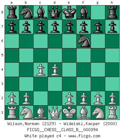Last move : c4 2026 April 14 17:29:35 White clock - 39 days 22:38:16 Black clock - 39 days 15:16:36 [Event "FICGS__CHESS__CLASS_B__000394"] [Site "FICGS"] [Date "2026.04.14"] [Round "1"] [White "Wilson,Norman"] [Black "Widelski,Kacper"] [Result "*"] [WhiteElo "2129"] [BlackElo "2000"] 1.d4 Nf6 2.c4 * Follow this game move after move (download)Not all artists are Chess players, but all Chess players are artists. (Marcel Duchamp) Das Spiel gibt uns die Genugtuung, die das Leben uns versagt. (Emanuel Lasker) El Ajedrez es un terrible juego. Si no controlas el centro, tu oponente tiene una posición mas holgada. Si tienes control del centro, ¡entonces realmente tu tienes algo de que preocuparte!. (Siegbert Tarrasch) Roi des jeux et jeu des rois, les échecs portent en eux un sentiment d'infini. Ils donnent à celui qui s'est efforcé d'en approfondir les arcanes l'impression de n'être pas à la mesure de l'homme; en fait, ils constituent un résumé de l'univers, un microcosme, et figurent cette grande échelle qui, dans les plans de la lumière descend jusqu'à la matière, qui des abîmes insondables remonte jusqu'en l'infini de Dieu. (Pyrame) Beta. Software undergoes beta testing shortly before it's released. Beta is latin for still doesn't work. (Anonymous)