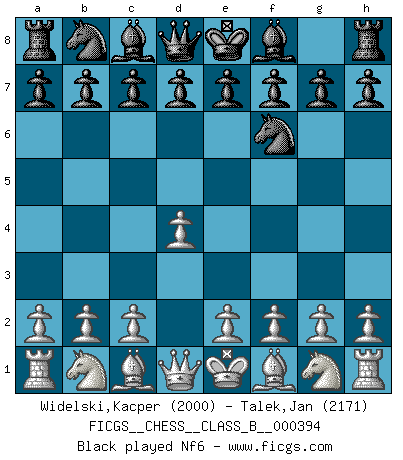 Last move : Nf6 2026 April 14 23:53:58 White clock - 39 days 19:48:04 Black clock - 39 days 17:10:59 [Event "FICGS__CHESS__CLASS_B__000394"] [Site "FICGS"] [Date "2026.04.14"] [Round "1"] [White "Widelski,Kacper"] [Black "Talek,Jan"] [Result "*"] [WhiteElo "2000"] [BlackElo "2171"] 1.d4 Nf6 2.* Follow this game move after move (download)Chess is the gymnasium of the mind. (Blaise Pascal) Kann Schach nicht schließlich das Nationalspiel der Deutschen werden? Und welche weiteren Ausblicke bieten sich dann dar! Welche Hebung des allgemeinen Kultur-Niveaus, ja der Moral, wenn das Schachbrett den Kartentisch verdrängen würde! Wahrlich, ein Ziel, des Schweißes der Edlen wert! (Siegbert Tarrasch) Coloca el contenido de las piezas del Ajedrez en un sombrero, agitalo vigorosamente, arrojalas en un tablero desde una altura de 30 centimetros y así obtendras el estilo de Steinitz. (H. E. Bird) Vous m'avez demandé de vous exposer quel est le fondement de la prière. Je ne fais que préparer les pièces du jeu sur la table... Nous sera-t-il permis d'en adopter les règles et si nous les appliquons scrupuleusement nous ne tarderons pas à faire mat le Roi divin ! Il ne pourra échapper à nos mains. (Sainte Thérèse d'Avila, Chemin de perfection) Coffee just isn't my cup of tea. (Unknown)