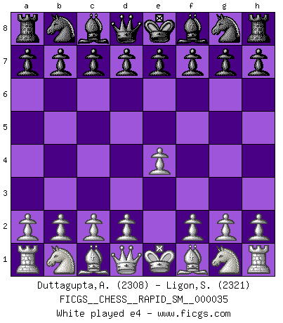 Last move : e4 2026 April 16 18:25:46 White clock - 30 days 23:25:56 Black clock - 29 days 20:25:33 [Event "FICGS__CHESS__RAPID_SM__000035"] [Site "FICGS"] [Date "2026.04.16"] [Round "1"] [White "Duttagupta,Aniruddha"] [Black "Ligon,Scott"] [Result "*"] [WhiteElo "2308"] [BlackElo "2321"] 1.e4 * Follow this game move after move (download)I'm not afraid of Spassky. The world knows I'm the best. You don't need a match to prove it. (Bobby Fischer) Fischer: 'Remis!?' Uhlmann: 'Aber es muss doch dreimal Zugwiederholung sein!' Fischer: 'Sie nehmen das Remis an, wie ich es sage, sonst spiele ich weiter und werde Sie dann schlagen!' (Robert James Fischer) Puntos débiles o agujeros en la posición de tu oponente deben de ser ocupados por piezas, no Peones. (Siegbert Tarrasch) Avant la finale, les dieux ont créé le milieu de partie. (Tarrasch) You can think I'm wrong, but that's no reason to quit thinking. (Gregory House, House M.D.)