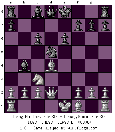 Last move : 1-0 2007 November 9 2:52:12 [Event "FICGS__CHESS__CLASS_E__000064"] [Site "FICGS"] [Date "2007.10.16"] [Round "1"] [White "Jiang,Matthew"] [Black "Lemay,Simon"] [Result "1-0"] [WhiteElo "1600"] [BlackElo "1600"] 1.e4 c5 2.Nf3 Nc6 3.d4 cxd4 4.Nxd4 Nf6 5.Nc3 e6 6.Be3 d5 7.exd5 Nxd5 8.Nxc6 bxc6 9.Qd2 Bb4 10.Bd4 1-0 Sicilian defense Player White won this chess game. Follow this game move after move (download)A bad plan is better than none at all. (Frank Marshall) Schach ist Leben. (Robert James Fischer) Aquel que teme a un Peón de Reina aislado, debería de retirarse del Ajedrez. (Siegbert Tarrasch) 'L'échange des dames est un coup dur pour les deux adversaires...' Un journaliste lors d'une partie du match Spassky-Fischer Just because you do not take an interest in politics doesn't mean politics won't take an interest in you. (Pericles 430 B.C.)