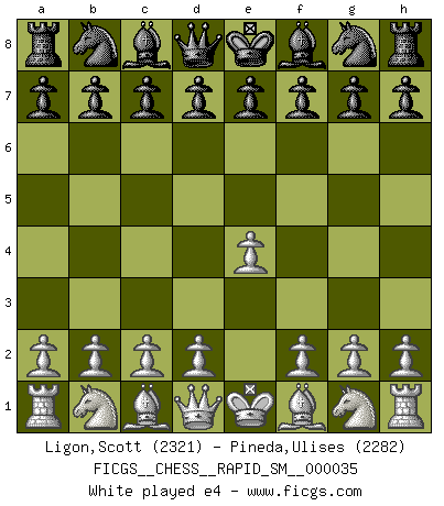 Last move : e4 2026 April 16 17:55:50 White clock - 30 days 23:55:52 Black clock - 29 days 18:09:28 [Event "FICGS__CHESS__RAPID_SM__000035"] [Site "FICGS"] [Date "2026.04.16"] [Round "1"] [White "Ligon,Scott"] [Black "Pineda,Ulises"] [Result "*"] [WhiteElo "2321"] [BlackElo "2282"] 1.e4 * Follow this game move after move (download)No one ever won a game by resigning. (Unknown) Ich verachte Kasparow. (Viktor Kortschnoi) El juego de Fischer siempre fue nítido, racional y brillante. Uno de los mejores por siempre. (Dave Regis) Donnez-moi un Cavalier en 6e et je gagnerais toutes mes parties. (Steinitz) A generalist learns less and less about more and more until he knows nothing about everything. (Author unknown)