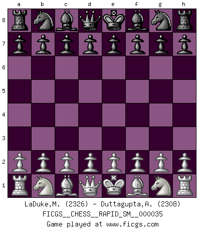 First move 2026 April 16 17:51:42 White clock - 29 days 19:51:29 Black clock - 30 days 00:00:00 [Event "FICGS__CHESS__RAPID_SM__000035"] [Site "FICGS"] [Date "2026.04.16"] [Round "1"] [White "LaDuke,Matt"] [Black "Duttagupta,Aniruddha"] [Result "*"] [WhiteElo "2326"] [BlackElo "2308"] 1.* Follow this game move after move (download)No price is too great for the scalp of the enemy King. (Koblentz) Gewinnen beim Schach fördert das Selbstvertrauen. Beim Sex spüre ich sowas nicht... (Garry Kasparov) Muchos se han convertido en Maestros de Ajedrez, nadie se ha convertido en el Maestro del Ajedrez. (Siegbert Tarrasch) Les échecs sont plus proches de l'art de l'assassinat que de l'art de la guerre. (Arturo Perez-Reverte) I live to kill Traxler counterattack. (Ilmars Cirulis)