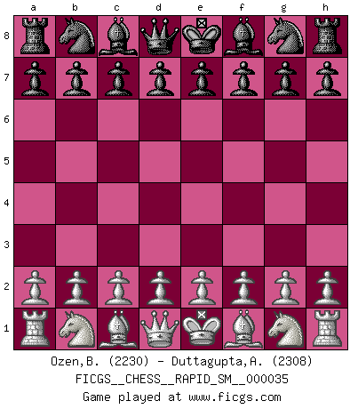 First move 2026 April 16 17:51:42 White clock - 29 days 19:49:46 Black clock - 30 days 00:00:00 [Event "FICGS__CHESS__RAPID_SM__000035"] [Site "FICGS"] [Date "2026.04.16"] [Round "1"] [White "Ozen,Bahadir"] [Black "Duttagupta,Aniruddha"] [Result "*"] [WhiteElo "2230"] [BlackElo "2308"] 1.* Follow this game move after move (download)Chess teaches you to control the initial excitement you feel when you see something that looks good and it trains you to think objectively when you're in trouble. (Stanley Kubrick) Weshalb minderdergeübte Spieler mit g2-g4 beginnen? Die betreffenden sind unschlüssig, ob sie nun rechts (h4) oder links (f4) beginnen sollen, und in ihrer Ratlosigkeit entschliessen sie sich nach guter Bürgerart dazu, den goldenen Mittelweg zu wählen. (Aaron Nimzowitsch) Hay dos clases de hombres: aquellos que se conforman en dejarse llevar por las circunstancias y que juegan barajas y aquellos decididos a controlar las circunstancias y que juegan al Ajedrez. (Mortimer Collins) Roi des jeux et jeu des rois, les échecs portent en eux un sentiment d'infini. Ils donnent à celui qui s'est efforcé d'en approfondir les arcanes l'impression de n'être pas à la mesure de l'homme; en fait, ils constituent un résumé de l'univers, un microcosme, et figurent cette grande échelle qui, dans les plans de la lumière descend jusqu'à la matière, qui des abîmes insondables remonte jusqu'en l'infini de Dieu. (Pyrame) There are two kinds of tragedy in this world, one is not getting what you want and the other is getting. (Lord of war)
