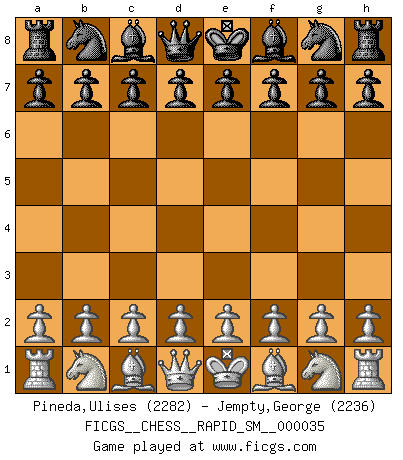 First move 2026 April 16 17:51:42 White clock - 29 days 18:05:21 Black clock - 30 days 00:00:00 [Event "FICGS__CHESS__RAPID_SM__000035"] [Site "FICGS"] [Date "2026.04.16"] [Round "1"] [White "Pineda,Ulises"] [Black "Jempty,George"] [Result "*"] [WhiteElo "2282"] [BlackElo "2236"] 1.* Follow this game move after move (download)Human affairs are like a Chess game: only those who do not take it seriously can be called good players. (Hung Tzu Ch'eng) Die größte Kunst beim Schach besteht darin dem Gegner nicht zu zeigen was er tun kann. (Garry Kasparov) Preferería tener un Peón que un dedo. (Reuben Fine) Tout change constamment, y compris dans le monde des Echecs. (Botvinnik) The weakness of an artist is dogma. (Josh Waitzkin)