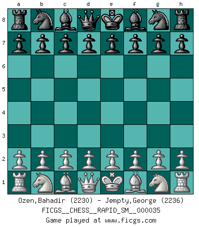 First move 2026 April 16 17:51:42 White clock - 29 days 16:26:34 Black clock - 30 days 00:00:00 [Event "FICGS__CHESS__RAPID_SM__000035"] [Site "FICGS"] [Date "2026.04.16"] [Round "1"] [White "Ozen,Bahadir"] [Black "Jempty,George"] [Result "*"] [WhiteElo "2230"] [BlackElo "2236"] 1.* Follow this game move after move (download)Bobby Fischer's current state of mind is indeed a tragedy. One of the world's greatest Chess players - the pride and sorrow of American Chess. (Frank Brady) Oft bringt ein stiller Zug das Erdbeben. (Richard Reti) Entre mas años cumplo, mas valoro los Peones. (Keres) Un journaliste : 'Vous préférez avoir une dame de plus sur l'échiquier ou au lit ?' Boris Spassky : 'Ca dépend de la position.' Warrior pose battles inner weakness and wins focus. You see that there is no war within you. You're on your own side, and you are your own strength. (Terri Guillemets)