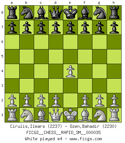 Last move : e4 2026 April 16 17:53:43 White clock - 30 days 23:57:59 Black clock - 29 days 16:28:34 [Event "FICGS__CHESS__RAPID_SM__000035"] [Site "FICGS"] [Date "2026.04.16"] [Round "1"] [White "Cirulis,Ilmars"] [Black "Ozen,Bahadir"] [Result "*"] [WhiteElo "2237"] [BlackElo "2230"] 1.e4 * Follow this game move after move (download)The mistakes are there, waiting to be made. (Savielly Tartakower) Wenn du nicht weißt was du tun sollst, warte bis dein Gegner eine Idee hat. Sie wird sicher schlecht sein. (Siegbert Tarrasch) La esencia del Ajedrez es pensar acerca de lo que el Ajedrez es. (David Bronstein) Karpov est une pièce de musée. (Garry Kasparov) You can only get smarter by playing a smarter opponent. (Revolver, movie)