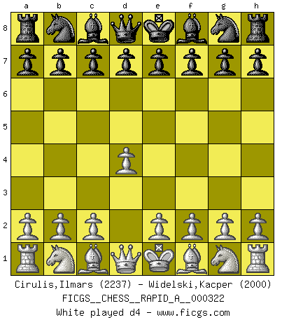 Last move : d4 2026 April 22 4:43:41 White clock - 30 days 19:46:19 Black clock - 29 days 21:09:11 [Event "FICGS__CHESS__RAPID_A__000322"] [Site "FICGS"] [Date "2026.04.22"] [Round "1"] [White "Cirulis,Ilmars"] [Black "Widelski,Kacper"] [Result "*"] [WhiteElo "2237"] [BlackElo "2000"] 1.d4 * Follow this game move after move (download)The hardest game to win is a won game. (Emanuel Lasker) Mein Gehirn das ist mein zweitwichtigstes Organ [Aus dem Film: Der Schläfer]. (Woody Allen) La maestría del Ajedrez consiste esencialmente en analizar posiciónes de Ajedrez con precisión. (Mikhail Botvinnik) Comme les marins qui ont mille raisons différentes d'aller en mer, les joueurs d'échecs en ont tout autant avant de s'installer devant une table et jouer... (Vincent Bertignac, philosophe) Wisdom is the reward you get for a lifetime of listening when you'd have preferred to talk. (Doug Larson)