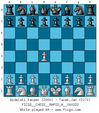 Last move : d4 2026 April 22 0:31:3 White clock - 30 days 23:58:57 Black clock - 29 days 16:56:40 [Event "FICGS__CHESS__RAPID_A__000322"] [Site "FICGS"] [Date "2026.04.22"] [Round "1"] [White "Widelski,Kacper"] [Black "Talek,Jan"] [Result "*"] [WhiteElo "2000"] [BlackElo "2171"] 1.d4 * Follow this game move after move (download)Chess opens and enriches your mind. (Saudin Robovic) Ich hatte Angst gegen einen russischen Großmeister zu verlieren, und er befürchtete gegen einen kleinen Jungen zu verlieren. (über ein Remis gegen Juri Awerbach). (Robert James Fischer) El Ajedrez es el gimnasio de la mente. (Blaise Pascal) Horreur, mais aussi harmonie suprême : qu'y avait-il en effet au monde en dehors des échecs ? Le brouillard, l'inconnu, le non-être... (Vladimir Nabokov) They say poker is a zero-sum game. It must be, because every time I play my sum ends up zero. (Max Shapiro)