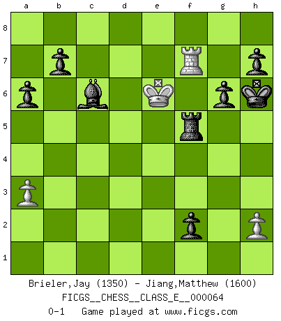 Last move : 0-1 2007 November 16 14:30:11 [Event "FICGS__CHESS__CLASS_E__000064"] [Site "FICGS"] [Date "2007.10.16"] [Round "1"] [White "Brieler,Jay"] [Black "Jiang,Matthew"] [Result "0-1"] [WhiteElo "1350"] [BlackElo "1600"] 1.e4 c5 2.Nf3 d6 3.d4 cxd4 4.Nxd4 Nf6 5.Nc3 a6 6.Be3 Ng4 7.Qf3 Nxe3 8.Qxe3 e6 9.f4 Nc6 10.e5 Qb6 11.O-O-O dxe5 12.fxe5 Bc5 13.Nce2 O-O 14.a3 Rd8 15.c3 Qc7 16.Qg5 Nxd4 17.cxd4 Bxd4 18.Kd2 Bf2 19.Nd4 Bxd4 20.Bd3 Bxe5 21.Ke1 Bf6 22.Qh5 g6 23.Qf3 Qe5+ 24.Kf2 Qxb2+ 25.Be2 Bd7 26.Rb1 Qd4+ 27.Kf1 Bc6 28.Qb3 Qd5 29.Qxd5 Rxd5 30.Kf2 Rad8 31.Rhc1 Rd2 32.Ke3 Bg5+ 33.Kf2 Rxe2+ 34.Kxe2 Bxc1 35.Rxc1 Bxg2 36.Rc7 Bc6 37.Ke3 f5 38.Kf4 Rd7 39.Rc8+ Kg7 40.Ke5 Rd5+ 41.Kxe6 f4 42.Rc7+ Kh6 43.Kf6 f3 44.Ke6 f2 45.Rf7 Rf5 0-1 Sicilian : Najdorf, Byrne (English) attack Queenside Castling by player White (move 11) Kingside Castling by player Black (move 13) Player Black won this chess game. Follow this game move after move (download)Daring ideas are like Chess men moved forward. They may be beaten, but they may start a winning game. (Johann Wolfgang von Goethe) Schach ist Krieg, im Schach geht es um testosterongesteuerte Urschreie. (Garry Kasparov) Peones: ellos son el alma de esta partida, solos forman el ataque y la defensa. (Philidor) Les Echecs ne sont pas pour les âmes timides. Ils requièrent un homme entier, qui ne s'arrête pas aveuglément à ce qui a été déjà établi, mais qui tente individuellement de sonder les profondeurs du jeu. (W. Steinitz) Games, world of games... There's always an opponent, and there's always a victim. (Revolver, movie)