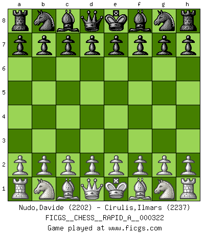 First move 2026 April 22 0:30:0 White clock - 29 days 16:53:05 Black clock - 30 days 00:00:00 [Event "FICGS__CHESS__RAPID_A__000322"] [Site "FICGS"] [Date "2026.04.22"] [Round "1"] [White "Nudo,Davide"] [Black "Cirulis,Ilmars"] [Result "*"] [WhiteElo "2202"] [BlackElo "2237"] 1.* Follow this game move after move (download)Good offense and good defense both begin with good development. (Bruce A. Moon) Obendrein hat der FIDE-Präsident den Revolutionsführer Gaddafi zum »Großmeister« ernannt, am Ende der WM. Das ist lächerlich! (Joel Lautier) La belleza de un movimiento no se refleja solo en su apariencia, sino en el pensamiento detrás de él. (Siegbert Tarrasch) On est toujours la mazette de quelqu'un d'autre. (Anonyme) I've never seen so many men wasted so badly. (Blondie in The Good, The Bad and The Ugly)