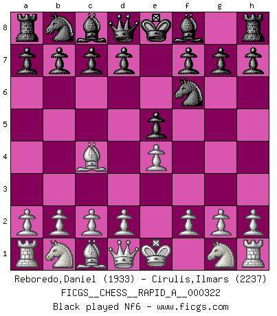 Last move : Bc4 2026 April 22 5:5:43 White clock - 31 days 20:07:25 Black clock - 30 days 20:46:59 [Event "FICGS__CHESS__RAPID_A__000322"] [Site "FICGS"] [Date "2026.04.22"] [Round "1"] [White "Reboredo,Daniel"] [Black "Cirulis,Ilmars"] [Result "*"] [WhiteElo "1933"] [BlackElo "2237"] 1.e4 e5 2.Bc4 * Follow this game move after move (download)I believe that Chess possesses a magic that is also a help in advanced age. A rheumatic knee is forgotten during a game of Chess and other events can seem quite unimportant in comparison with a catastrophe on the chessboard. (Vlastimil Hort) Der Schachmeister von Heute braucht Courage, einen Killerinstinkt, Ausdauer und Arroganz. (Larry Evans) El Rey es una pieza de pelea. ¡Usenlo!. (Wilhelm Steinitz) Les Echecs sont affaire de jugement sensible. Savoir quand frapper et quand esquiver. (Fischer) . 'gn is not allowed in chess unless n is an integer between 1 and 8 inclusive, where 1 and 8 are to interpreted as the standard numerals standing for integers in the ordered real-closed field R, with the *canonical* ordering. (As opposed to, say, an integer in the domain Z[2+i*sqrt(5)] or an integer in some exotic Grothendieck topos). (Normajean Yates)