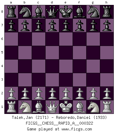 First move 2026 April 22 0:30:0 White clock - 29 days 16:53:57 Black clock - 30 days 00:00:00 [Event "FICGS__CHESS__RAPID_A__000322"] [Site "FICGS"] [Date "2026.04.22"] [Round "1"] [White "Talek,Jan"] [Black "Reboredo,Daniel"] [Result "*"] [WhiteElo "2171"] [BlackElo "1933"] 1.* Follow this game move after move (download)The sign of a great Master is his ability to win a won game quickly and painlessly. (Irving Chernev) Ein Schachgenie ist jemand der verdammt gut Schach spielt. (Jonathan Levitt) Por tratar de evitar la pérdida de una pieza, muchas personas han perdido una partida de Ajedrez. (Savielly Tartakover) Il n'y a pas de prix trop élevé au scalp de l'ennemi. (Koblentz) All art requires courage. (Anne Tucker)