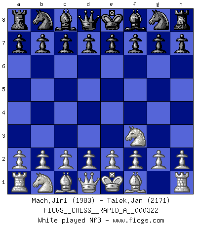 Last move : Nf3 2026 April 22 0:33:4 White clock - 30 days 23:56:56 Black clock - 29 days 16:57:01 [Event "FICGS__CHESS__RAPID_A__000322"] [Site "FICGS"] [Date "2026.04.22"] [Round "1"] [White "Mach,Jiri"] [Black "Talek,Jan"] [Result "*"] [WhiteElo "1983"] [BlackElo "2171"] 1.Nf3 * Follow this game move after move (download)Pawns: they are the soul of this game, they alone form the attack and defense. (Philidor) Ein bischen Romantik kann weder im Schach noch in der Liebe schaden. Also versuche ich mich ab und zu daran zu erinnern. (Nigel Short) Los Peones son nacidos libres, y aún así, se encuentran encadenados por todos lados. (Rick Kennedy) Ce qui caractérise les parties de combat, c'est que si le défenseur a constamment de difficiles problèmes à résoudre, l'attaquant doit chercher sans relâche de nouvelles possibilités d'attaque. (Koblentz) Lottery : A tax on people who are bad at math. (Author unknown)