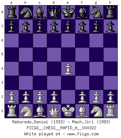 Last move : e4 2026 April 22 4:1:28 White clock - 30 days 20:28:32 Black clock - 29 days 20:25:52 [Event "FICGS__CHESS__RAPID_A__000322"] [Site "FICGS"] [Date "2026.04.22"] [Round "1"] [White "Reboredo,Daniel"] [Black "Mach,Jiri"] [Result "*"] [WhiteElo "1933"] [BlackElo "1983"] 1.e4 * Follow this game move after move (download)The boy (then a 12 year old boy named Anatoly Karpov) doesn't have a clue about Chess, and there's no future at all for him in this profession. (Mikhail Botvinnik) Ich würde mich als ganz normalen Jungen bezeichnen [Im Alter von 12]. (Sergej Karjakin) El Ajedrez es una manera fabulosa para que los niños aprendan a autovalorarse y a autoestimarse. (Saudin Robovic) Même un GMI sait rarement calculer sur plus de cinq coups une attaque à sacrifices. (Rudolf Spielmann) No, no, you're not thinking; you're just being logical. (Niels Bohr)