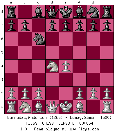 Last move : 1-0 2007 November 9 2:53:51 [Event "FICGS__CHESS__CLASS_E__000064"] [Site "FICGS"] [Date "2007.10.16"] [Round "1"] [White "Barradas,Anderson"] [Black "Lemay,Simon"] [Result "1-0"] [WhiteElo "1266"] [BlackElo "1600"] 1.e4 c5 2.Nf3 Nc6 3.d4 cxd4 4.Nxd4 1-0 Sicilian defense Player White won this chess game. Follow this game move after move (download)Adequate compensation for a sacrifice is having a sound combination leading to a winning position; adequate compensation for a blunder is having your opponent snatch defeat from the jaws of victory. (Bruce A. Moon) Irgendwie scheint mir sonntags früh um 9 Uhr der Killerinstinkt verloren gegangen zu sein. (Alexej Shirov) Hay jugadores fuertes y personas amables y yo soy un jugador fuerte. (Bobby Fischer) Le jeu d'échecs est comme rejeté hors du temps. (Antoine de Saint-Exupéry) All war is based on deception. (Sun Tzu)