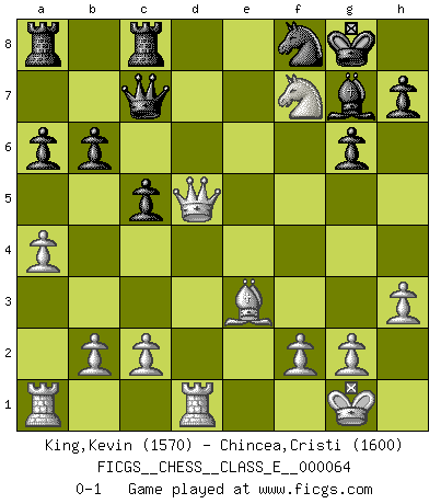 Last move : 0-1 2008 February 21 13:56:11 [Event "FICGS__CHESS__CLASS_E__000064"] [Site "FICGS"] [Date "2007.10.16"] [Round "1"] [White "King,Kevin"] [Black "Chincea,Cristi"] [Result "0-1"] [WhiteElo "1570"] [BlackElo "1600"] 1.e4 d6 2.Nf3 g6 3.d4 Bg7 4.Nc3 Nf6 5.Be3 O-O 6.h3 b6 7.Bd3 Bb7 8.O-O Nbd7 9.Qd2 c5 10.d5 Re8 11.a4 a6 12.Qe2 Qc7 13.Rfd1 Rec8 14.Qd2 e6 15.dxe6 fxe6 16.Ng5 Nf8 17.Bc4 d5 18.exd5 exd5 19.Nxd5 Nxd5 20.Bxd5+ Bxd5 21.Qxd5+ Kh8 22.Nf7+ Kg8 0-1 King's pawn Opening Kingside Castling by player Black (move 5) Kingside Castling by player White (move 8) Player Black won this chess game. Follow this game move after move (download)You know, comrade Pachman, I don't enjoy being a Minister, I would rather play Chess like you. (Che Guevara) Es tut gut, die Entwicklungsperiode von, [...] demokratischem Geist durchdringen zu lassen. Wie undemokratisch wäre es doch beispielsweise, den einen Offizier große Spaziertouren vornehmen zu lassen, während die anderen zu Hause säßen und sich entsetzlich langweilten. (Aaron Nimzowitsch) La vida es como el Ajedrez, con lucha, competición y eventos buenos y malos. (Benjamin Franklin) Que feriez-vous si vous étiez en train de jouer aux échecs et que la fin du monde arrive ? Je continuerais à jouer. (Saint Borromée) Statistics can be made to prove anything - even the truth. (Author unknown)