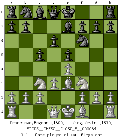 Last move : 0-1 2007 December 4 20:17:32 [Event "FICGS__CHESS__CLASS_E__000064"] [Site "FICGS"] [Date "2007.10.16"] [Round "1"] [White "Cranciova,Bogdan"] [Black "King,Kevin"] [Result "0-1"] [WhiteElo "1600"] [BlackElo "1570"] 1.Nf3 Nf6 2.Nc3 d6 3.e4 e5 4.d3 Be7 5.Be3 c5 0-1 This chess game has been lost on time (started : 2007.10.16 23:0:11) Reti Opening Player Black won this chess game. Follow this game move after move (download)Fischer is completely natural. He plays no roles. He's like a child. Very, very simple. (Zita Rajcsanyi) Ich kenne Menschen, die allen Willen der Welt besitzen und doch nicht Schach spielen können. (Robert James Fischer) Mis oponentes también hacen buenas movidas. A veces yo no tomo esas cosas en consideración. (Bobby Fischer) La guerre est enfant de la passion, la passion est enfant du narcissisme et le narcissisme est l'enfant. (...) Une autre partie ? (Thibault de Vassal) There's no money in correspondence chess. (John Knudsen)