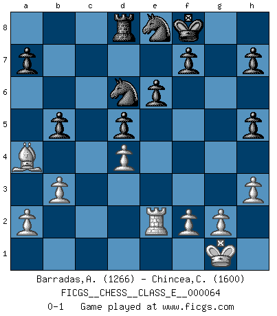 Last move : 0-1 2007 November 23 14:3:29 [Event "FICGS__CHESS__CLASS_E__000064"] [Site "FICGS"] [Date "2007.10.16"] [Round "1"] [White "Barradas,Anderson"] [Black "Chincea,Cristi"] [Result "0-1"] [WhiteElo "1266"] [BlackElo "1600"] 1.e4 d6 2.d4 g6 3.Nf3 Bg7 4.Nc3 Nf6 5.Bd3 O-O 6.O-O Ne8 7.Re1 Bg4 8.h3 Bxf3 9.Qxf3 Bxd4 10.Nd5 e6 11.Nf4 Qf6 12.c3 Bb6 13.Qg3 Nc6 14.Nh5 Qe5 15.Qxe5 Nxe5 16.Bh6 gxh5 17.Bxf8 Kxf8 18.Bb5 c6 19.Ba4 Rd8 20.Rad1 d5 21.exd5 Nc4 22.Re2 cxd5 23.b3 Ncd6 24.Rd4 Bxd4 25.cxd4 b5 0-1 King's pawn Opening Kingside Castling by player Black (move 5) Kingside Castling by player White (move 6) Player Black won this chess game. Follow this game move after move (download)Pawns: they are the soul of this game, they alone form the attack and defense. (Philidor) Immer nach dem besten Zug zu suchen ist ziemlich unpraktisch. (Nigel Short) Si yo gano un torneo, yo lo gano por mí mismo. Yo hago las jugadas. Nadie me ayuda. (Bobby Fischer) Seul un grand joueur sait à quel point il joue faiblement. (Xavier Tartacover) The ego is not master in its own house. (Sigmund Freud)