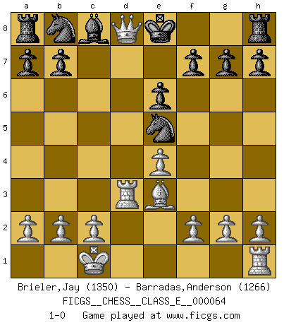 Last move : 1-0 2007 October 26 21:42:27 [Event "FICGS__CHESS__CLASS_E__000064"] [Site "FICGS"] [Date "2007.10.16"] [Round "1"] [White "Brieler,Jay"] [Black "Barradas,Anderson"] [Result "1-0"] [WhiteElo "1350"] [BlackElo "1266"] 1.e4 c5 2.Nf3 d6 3.d4 e6 4.dxc5 Qa5+ 5.Nc3 Qxc5 6.Be3 Qc6 7.Bb5 Qxb5 8.Nxb5 Na6 9.Nxd6+ Bxd6 10.Qxd6 Ne7 11.O-O-O Nc6 12.Ne5 Nab8 13.Rd3 Nxe5 14.Qd8+ 1-0 Sicilian Queenside Castling by player White (move 11) Player White won this chess game. Follow this game move after move (download)Checkers is for tramps. (Paul Morphy) Weshalb minderdergeübte Spieler mit g2-g4 beginnen? Die betreffenden sind unschlüssig, ob sie nun rechts (h4) oder links (f4) beginnen sollen, und in ihrer Ratlosigkeit entschliessen sie sich nach guter Bürgerart dazu, den goldenen Mittelweg zu wählen. (Aaron Nimzowitsch) Del Ajedrez se ha dicho que la vida no es lo suficientemente larga para él, pero eso es culpa de la vida, no del Ajedrez. (William Ewart Napier) Psychologiquement, tu dois avoir confiance en toi même, mais cette confiance doit être basée sur des faits. (Robert Fischer) Life is the sum of all your choices. (Albert Camus)