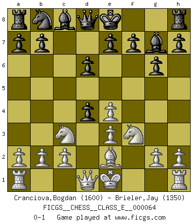 Last move : 0-1 2007 November 29 19:56:39 [Event "FICGS__CHESS__CLASS_E__000064"] [Site "FICGS"] [Date "2007.10.16"] [Round "1"] [White "Cranciova,Bogdan"] [Black "Brieler,Jay"] [Result "0-1"] [WhiteElo "1600"] [BlackElo "1350"] 1.e4 c5 2.d3 d6 3.Nc3 Nf6 4.Be2 g6 5.Nf3 Bg7 6.Be3 Ng4 7.d4 Nxe3 8.fxe3 cxd4 0-1 This chess game has been lost on time (started : 2007.10.16 23:0:11) Sicilian defense Player Black won this chess game. Follow this game move after move (download)Could we look into the head of a Chess player, we should see there a whole world of feelings, images, ideas, emotion and passion. (Alfred Binet) Wie kann ich Remis annehmen? Ich weiß ja gar nicht, wie ich stehe! (Fritz Sämisch) El Ajedrez es 99 por ciento táctica. (Teichmann) Il vaut toujours mieux jouer un plan faux de façon logique que de n'avoir pas de plan du tout. (Victor Kortchnoï) The mind is like a parachute, it only functions when its open. (Unknown)