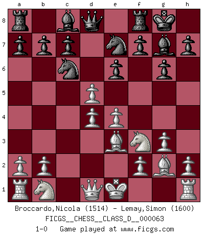 Last move : 1-0 2007 November 9 2:53:23 [Event "FICGS__CHESS__CLASS_D__000063"] [Site "FICGS"] [Date "2007.10.17"] [Round "1"] [White "Broccardo,Nicola"] [Black "Lemay,Simon"] [Result "1-0"] [WhiteElo "1514"] [BlackElo "1600"] 1.c4 g6 2.g3 Bg7 3.Bg2 Nc6 4.Nf3 e6 5.d4 Nge7 6.e4 O-O 7.Be3 d5 8.cxd5 1-0 English Opening Kingside Castling by player Black (move 6) Player White won this chess game. Follow this game move after move (download)My style is somewhere between that of Tal and Petrosian. (Reshevsky) Schach ist die gewalttätigste aller Sportarten. (Garry Kasparov) El Ajedrez moderno está demasiado preocupado con cosas como la estructura de Peones. Olvidenlo, el Jaque Mate termina la partida. (Nigel Short) La victoire dans une partie d'Echecs appartient la plupart du temps à celui qui voit un peu plus loin que l'adversaire. (Lasker) There is a great deal of difference between an eager man who wants to read a book and a tired man who wants a book to read. (G.K. Chesterton)
