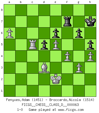 Last move : 1-0 2008 February 5 9:46:59 [Event "FICGS__CHESS__CLASS_D__000063"] [Site "FICGS"] [Date "2007.10.17"] [Round "1"] [White "Fenyves,Adam"] [Black "Broccardo,Nicola"] [Result "1-0"] [WhiteElo "1451"] [BlackElo "1514"] 1.e4 d6 2.d4 Nf6 3.Nc3 g6 4.f4 Bg7 5.e5 dxe5 6.dxe5 Qxd1+ 7.Kxd1 Nfd7 8.Nd5 Kd8 9.Nf3 e6 10.Nc3 Nb6 11.Be3 Bd7 12.Kd2 Nd5 13.Nxd5 exd5 14.c4 Be6 15.Nd4 c6 16.Nxe6+ fxe6 17.Rc1 Nd7 18.cxd5 cxd5 19.Bd3 Nb8 20.Bb5 Nd7 21.h4 a6 22.Be2 h5 23.Bd3 Bh6 24.Ke2 Nf8 25.Rc2 Rh7 26.g3 Ke8 27.Rhc1 Rd7 28.a4 Bg7 29.b4 Kf7 30.Rc7 Rad8 31.b5 Kg8 32.Rxd7 Rxd7 33.bxa6 bxa6 34.Bxa6 Rd8 35.Rc8 Rd7 36.Bc5 Rf7 37.a5 Kh7 38.Bd3 Nd7 39.Bd4 Bf8 40.a6 Bc5 41.Bxc5 Nxc5 42.Rxc5 1-0 Pirc : Austrian attack Player White won this chess game. Follow this game move after move (download)I like to say that Bobby Fischer was the greatest player ever. But what made Fischer a genius was his ability to blend an American freshness and pragmatism with Russian ideas about strategy. (Bruce Pandolfini) Jeder leidlich begabte Spieler, er braucht keineswegs hervorragend veranlagt zu sein, kann es zum Meister bringen. Aber das ist ja auch gar nicht nötig! Der richtige Standpunkt ist es, zu seinem Vergnügen zu spielen, und man glaube ja nicht, dass der Genuss proportional dem Können sei. (Siegbert Tarrasch) Si yo gano un torneo, yo lo gano por mí mismo. Yo hago las jugadas. Nadie me ayuda. (Bobby Fischer) Vous m'avez demandé de vous exposer quel est le fondement de la prière. Je ne fais que préparer les pièces du jeu sur la table... Nous sera-t-il permis d'en adopter les règles et si nous les appliquons scrupuleusement nous ne tarderons pas à faire mat le Roi divin ! Il ne pourra échapper à nos mains. (Sainte Thérèse d'Avila, Chemin de perfection) May I never be complete. May I never be content. May I never be perfect. Deliver me, Tyler, from being perfect and complete. (Chuck Palahniuk, Fight Club)