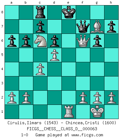 Last move : 1-0 2008 January 11 15:28:53 [Event "FICGS__CHESS__CLASS_D__000063"] [Site "FICGS"] [Date "2007.10.17"] [Round "1"] [White "Cirulis,Ilmars"] [Black "Chincea,Cristi"] [Result "1-0"] [WhiteElo "1543"] [BlackElo "1600"] 1.d4 Nf6 2.c4 g6 3.Nc3 Bg7 4.e4 d6 5.Nf3 O-O 6.Be2 Nbd7 7.O-O b6 8.e5 Ne8 9.e6 fxe6 10.Ng5 Ndf6 11.Bf3 Rb8 12.Nb5 a6 13.Na7 Bb7 14.Nxe6 Bxf3 15.Qxf3 Qd7 16.Nxf8 Kxf8 17.Nc6 Rc8 18.Re1 e6 19.Bd2 Kf7 20.d5 e5 21.Rxe5 Kf8 22.Re6 Bh8 23.Bh6+ Bg7 24.Rxf6+ Nxf6 25.Qxf6+ Qf7 26.Bxg7+ Ke8 27.Re1+ 1-0 King's Indian : 6.Be2 Kingside Castling by player Black (move 5) Kingside Castling by player White (move 7) Player White won this chess game. Follow this game move after move (download)You need not play well - just help your opponent to play badly. (Genrikh Chepukaitis) Ich habe kein Problem mit Frauen, sondern nur mit dem Niveau ihres Schachspiels (Judith Polgar) En el tablero, la mentira e hipocresía no sobreviven mucho. (Emanuel Lasker) Les Echecs représentent une sphère d'idées créatrices basée sur la volonté des deux protagonistes. (Smyslov) Luck is the residue of design. (John Milton)
