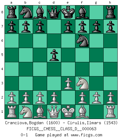 Last move : 0-1 2007 December 2 20:7:7 [Event "FICGS__CHESS__CLASS_D__000063"] [Site "FICGS"] [Date "2007.10.17"] [Round "1"] [White "Cranciova,Bogdan"] [Black "Cirulis,Ilmars"] [Result "0-1"] [WhiteElo "1600"] [BlackElo "1543"] 1.e3 d5 2.Nf3 Nf6 0-1 This chess game has been lost on time (started : 2007.10.17 10:1:11) Van't Kruijs Opening Player Black won this chess game. Follow this game move after move (download)The tactician knows what to do when there is something to do; whereas the strategian knows what to do when there is nothing to do. (Gerald Abrahams) Der Bart als Geschlechtszeichen mitten im Gesicht ist obszön. Daher gefällt er den Weibern. [Zugegeben, kein Schachzitat, aber unglaublich originell] (Arthur Schopenhauer) Con el tiempo, empecé a progresar en partidas decisivas. Tal vez porque me di cuenta de una simple verdad: no solo estaba yo nervioso sino también mi oponente. (Mikhail Tal) Même un GMI sait rarement calculer sur plus de cinq coups une attaque à sacrifices. (Rudolf Spielmann) Now be brave and don't look back. Don't look back. (Shmi Skywalker in Star Wars ep.1)