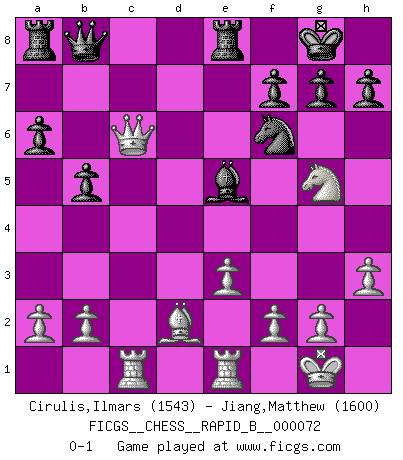 Last move : 0-1 2008 January 1 22:19:2 [Event "FICGS__CHESS__RAPID_B__000072"] [Site "FICGS"] [Date "2007.10.17"] [Round "1"] [White "Cirulis,Ilmars"] [Black "Jiang,Matthew"] [Result "0-1"] [WhiteElo "1543"] [BlackElo "1600"] 1.d4 d5 2.c4 c6 3.Nc3 Nf6 4.e3 e6 5.Nf3 Nbd7 6.Bd2 Be7 7.Bd3 O-O 8.Rc1 Bd6 9.O-O dxc4 10.Bxc4 e5 11.Bb3 a6 12.Re1 b5 13.Ng5 Qc7 14.Nd5 Nxd5 15.Bxd5 Bb7 16.Bxc6 Bxc6 17.Qc2 Nf6 18.Qxc6 Qb8 19.h3 Re8 20.dxe5 Bxe5 0-1 This chess game has been lost on time (started : 2007.10.17 16:56:22) QGD Slav defense Kingside Castling by player Black (move 7) Kingside Castling by player White (move 9) Player Black won this chess game. Follow this game move after move (download)The only thing Chess players have in common is Chess. (Lodewijk Prins) Ich bin Weltmeister und muß mit niemandem irgend etwas diskutieren. (Viswanathan Anand) De todos mis libros Rusos, la defensa contiene y difunde el 'calor' mas grande que pudiese verse extraño al observar lo supremamente abstracto que el Ajedrez supuestamente es. (Vladimir Nabokov) Je ne suis pas le dernier à jouer lâchement des coups douteux pendant le zeïtnot de l'adversaire pour l'achever: en effet les coups qui font le plus peur sont ceux que l'on ne comprend pas. Je me fais souvent peur quand je joue. (Un professeur anonyme) Your best chance to get a Royal Flush in a casino is in the bathroom. (Anonymous)